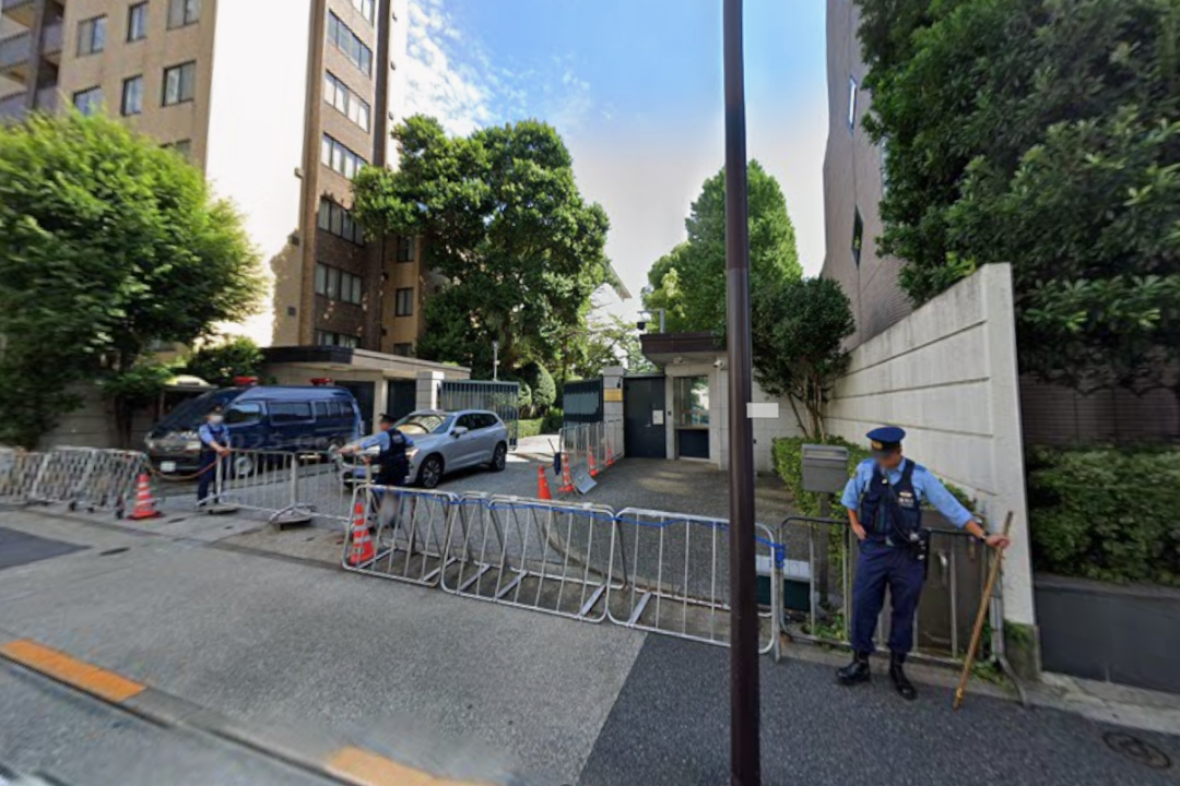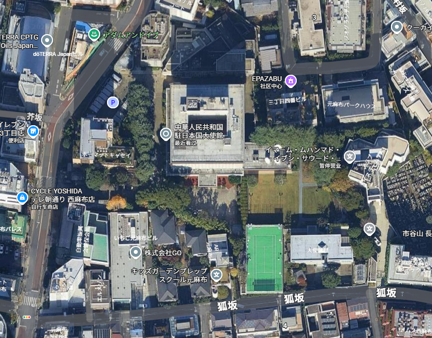 ▲中国驻日大使馆卫星图,周围的几栋民房都可以跳进去