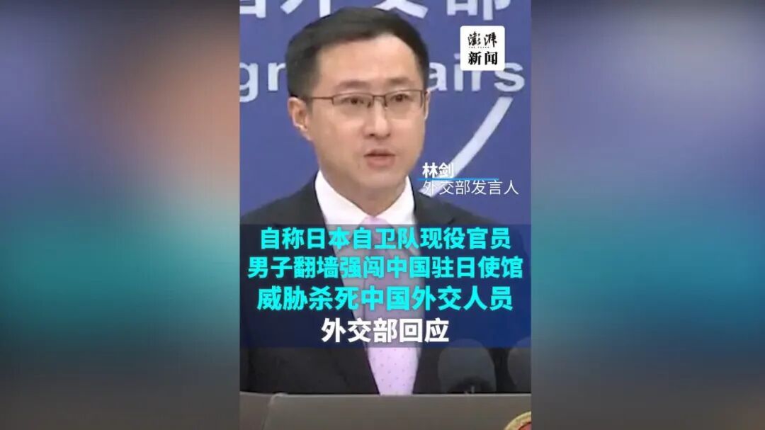 昨天中国外交部发言人回应此事件称,一名自称为日本自卫队现役官员的不法之徒翻墙强行闯入中国驻日本大使馆,此人承认自身行为违法,威胁要以所谓“神的名义”杀死中国外交人员。