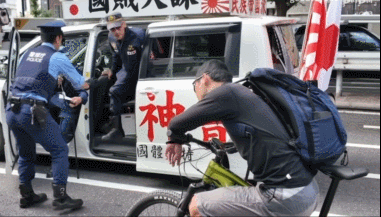 ▲日本极端右翼团体在大街上喊“反华”口号,并袭击反对的路人