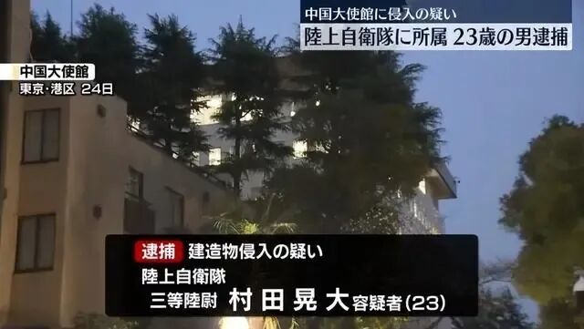 当天9点左右,他从隔壁居民楼的四楼爬过使馆围墙,进入使馆内部,向使馆工作人员表示自己自卫队军官的身份,希望面见中国大使,随即被工作人员控制。12点40分,使馆方面向警方通报情况,日本警察随后到场管控村田晃大,警察在使馆内的草丛中发现一把刀刃18厘米长的刀具。