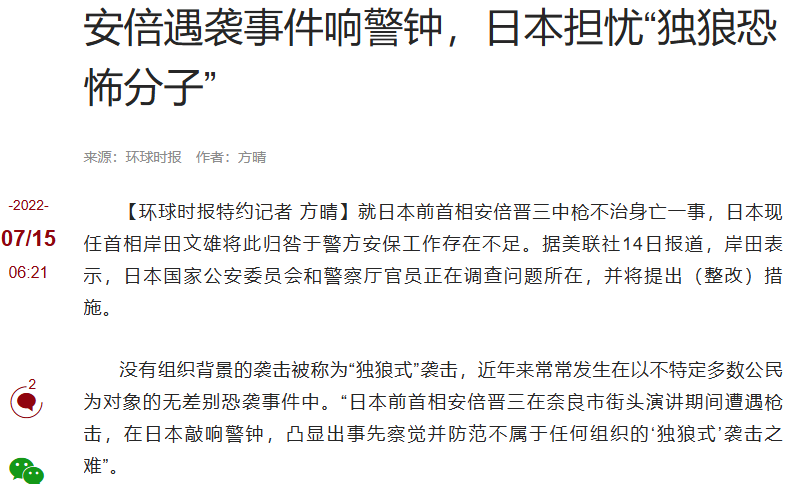 2022年7月8日,日本前首相安倍晋三在奈良街头演讲时,被山上彻也用自制枪支从背后射击,一枪击中要害不治身亡。