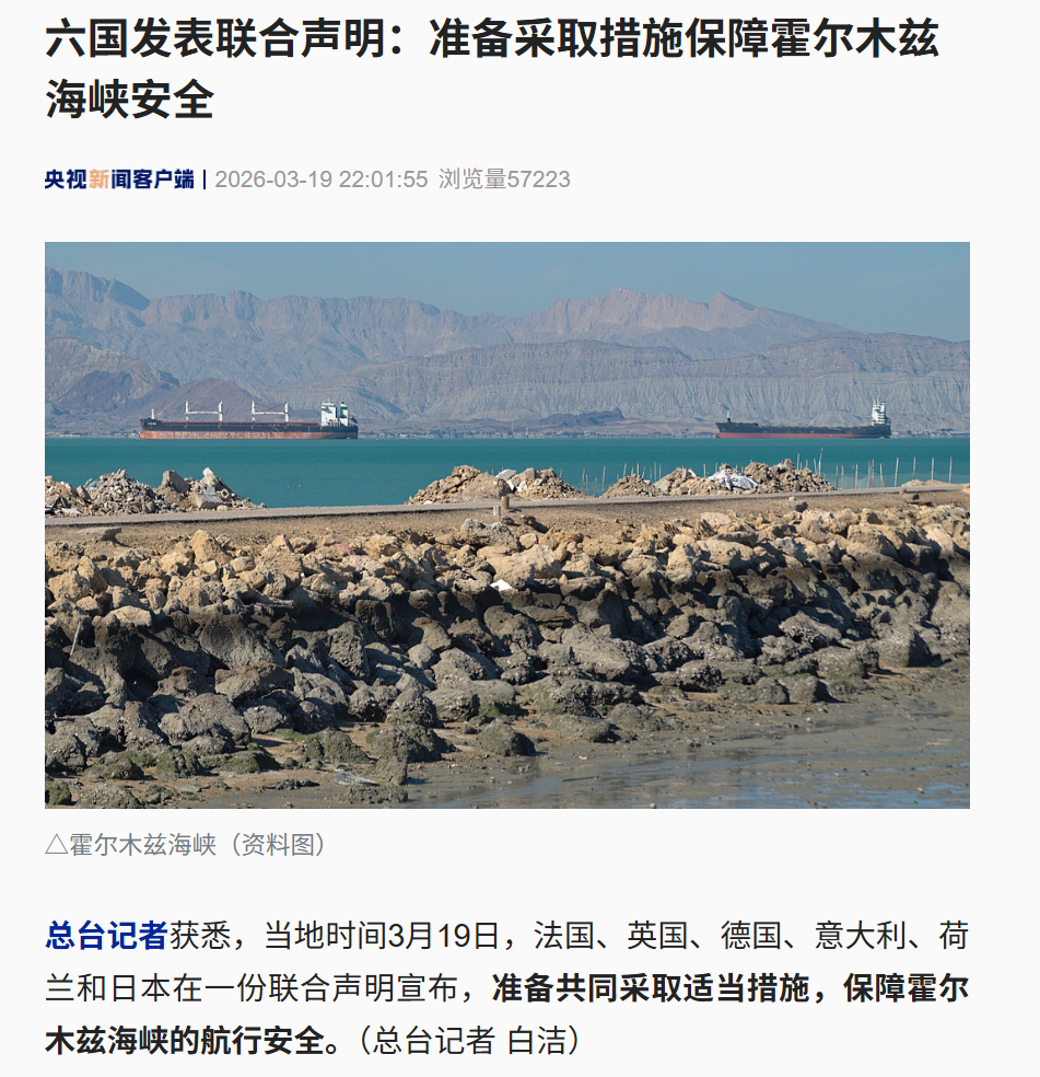 总台记者获悉,当地时间3月19日,法国、英国、德国、意大利、荷兰和日本在一份联合声明宣布,准备共同采取适当措施,保障霍尔木兹海峡的航行安全。